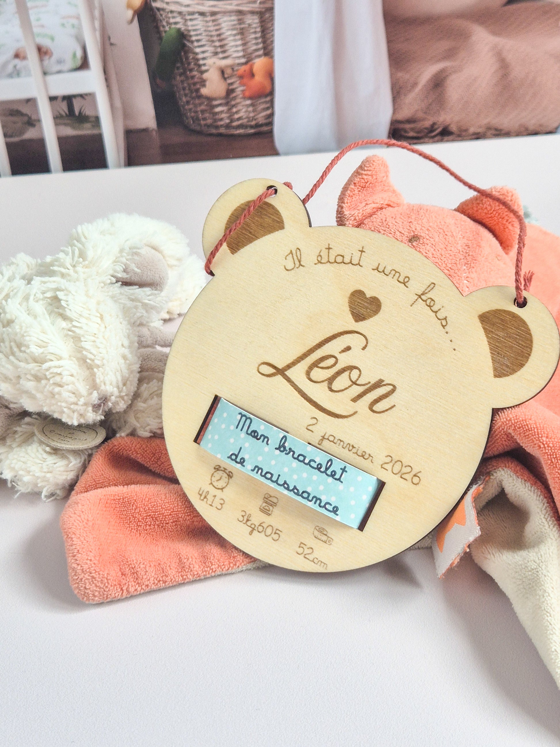 Immortalisez les premiers instants de votre bébé avec cette douce carte en bois en forme de tête d’ourson, imaginée pour conserver et mettre en valeur son bracelet de naissance.