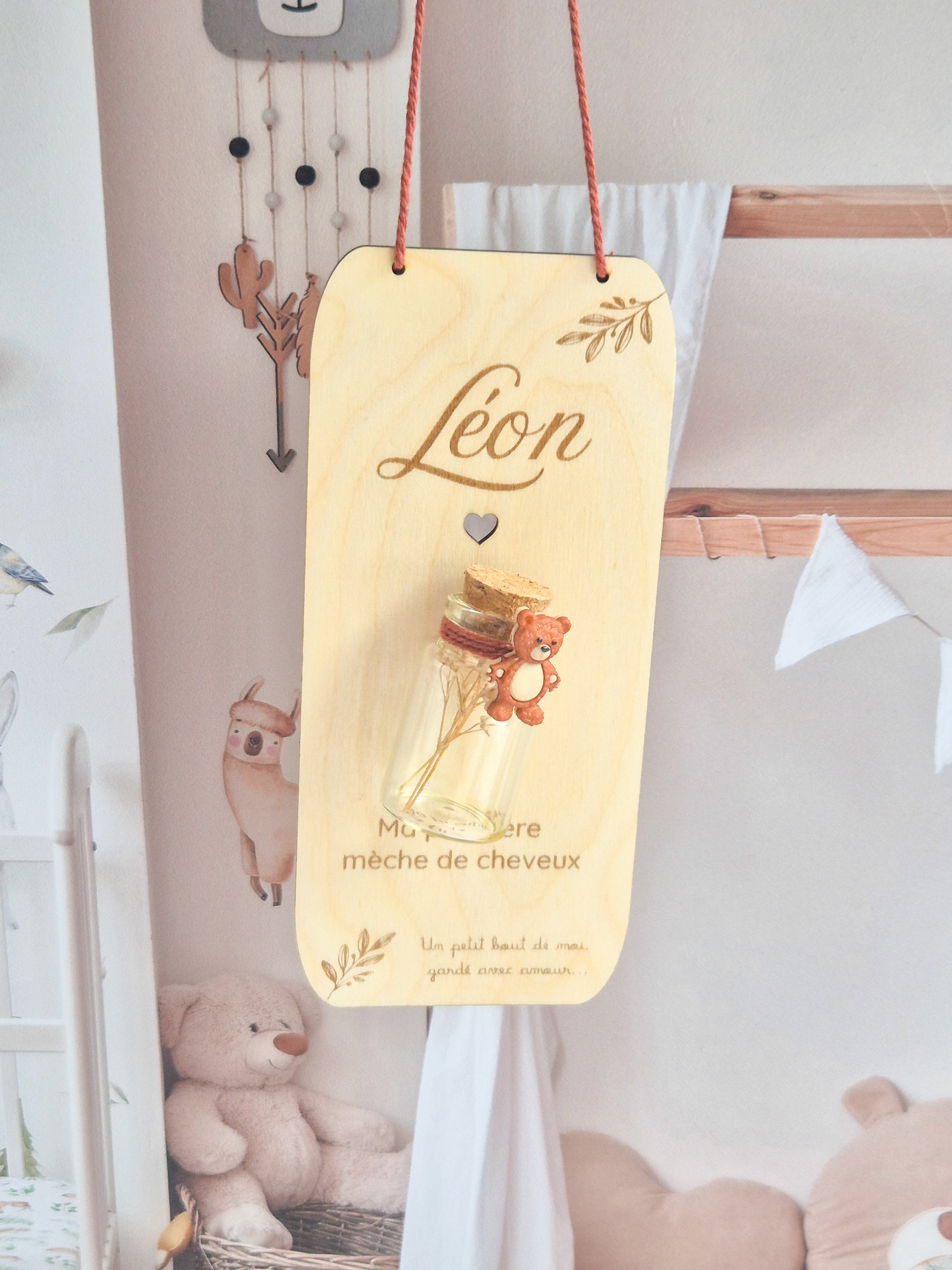 Cette carte en bois accompagnée de sa délicate fiole en verre est pensée pour conserver précieusement la toute première mèche de cheveux de votre enfant, et en faire un souvenir unique à transmettre.
