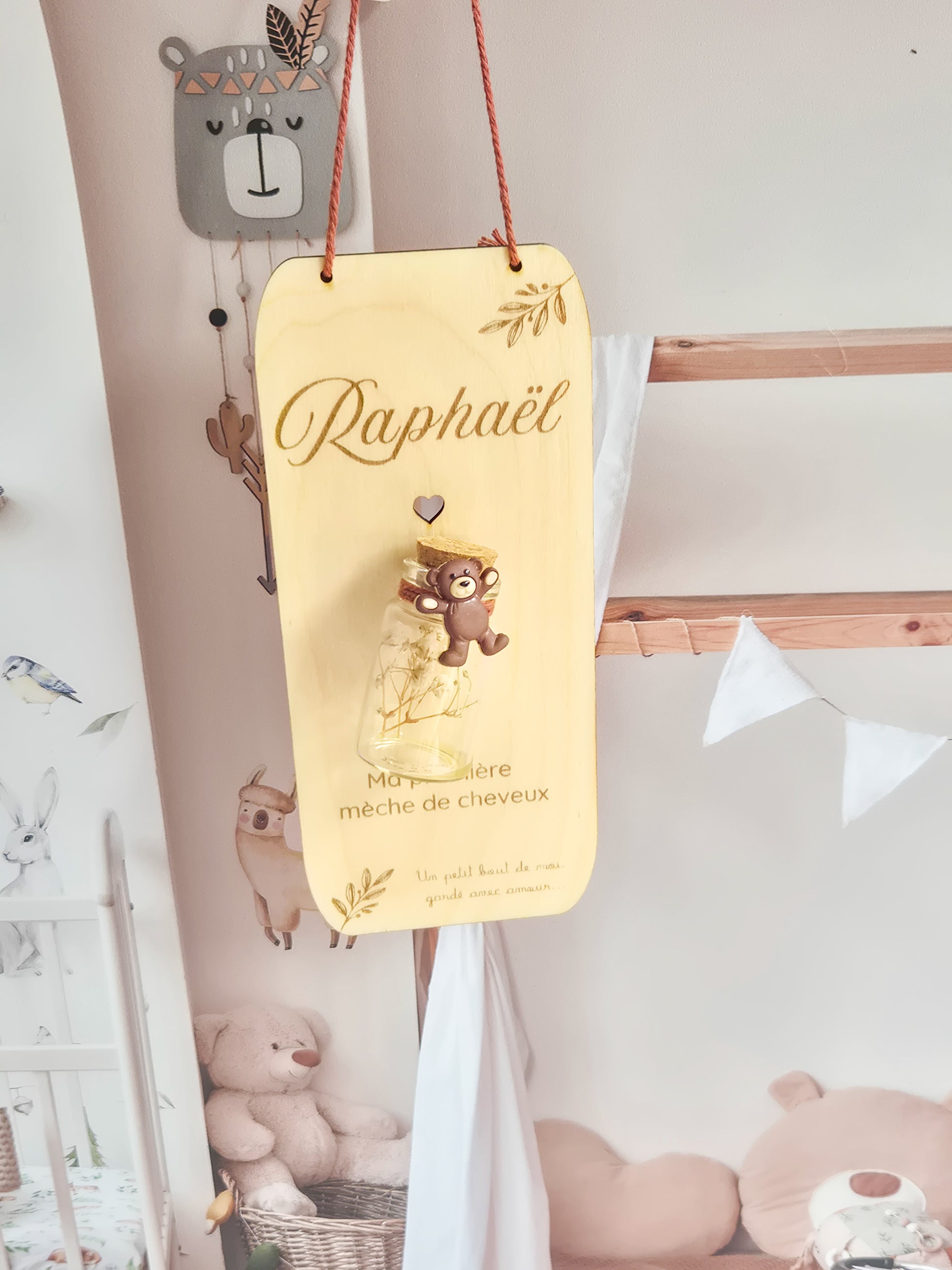 - Gravure du prénom de l’enfant sur la plaque en bois