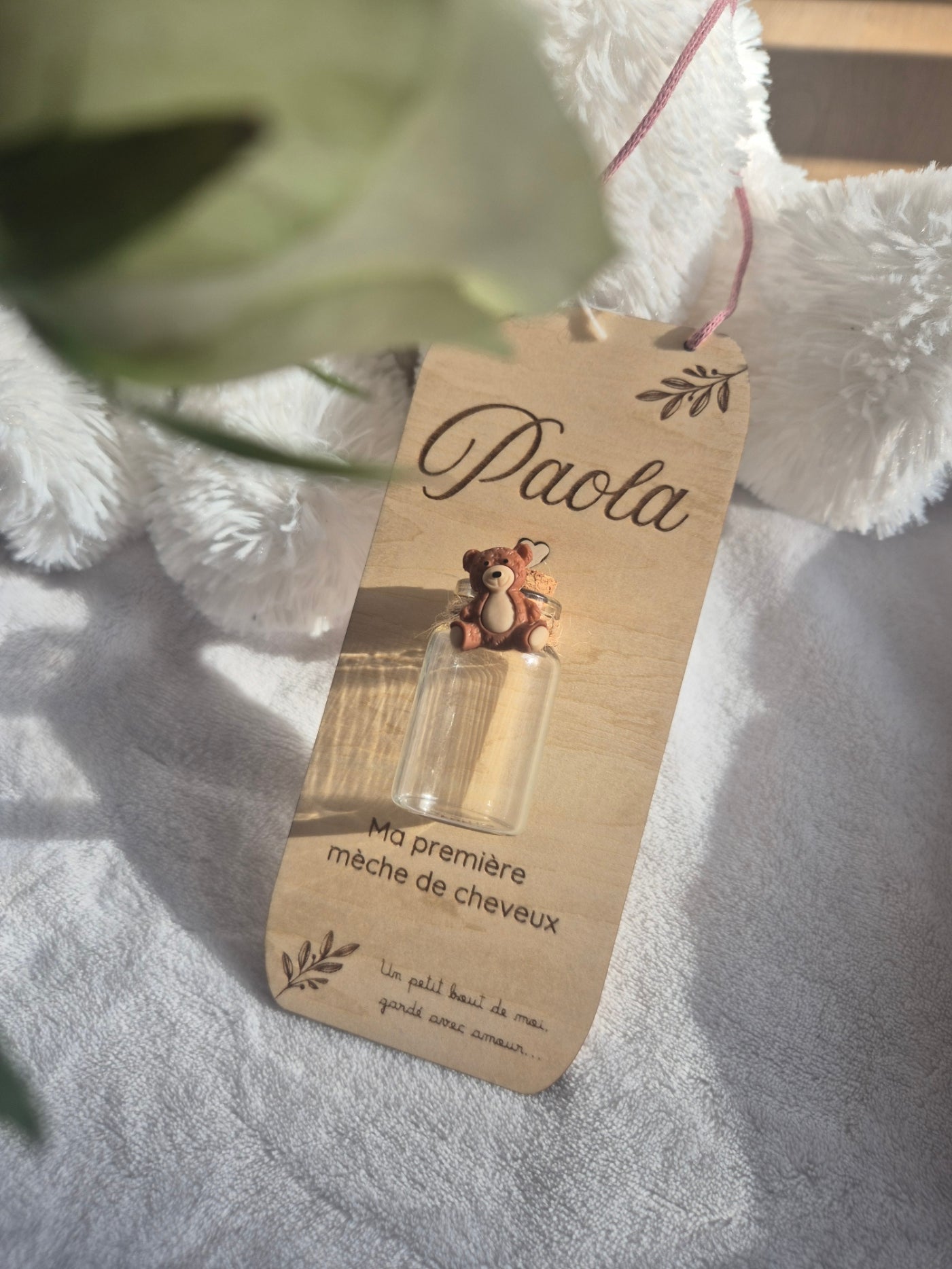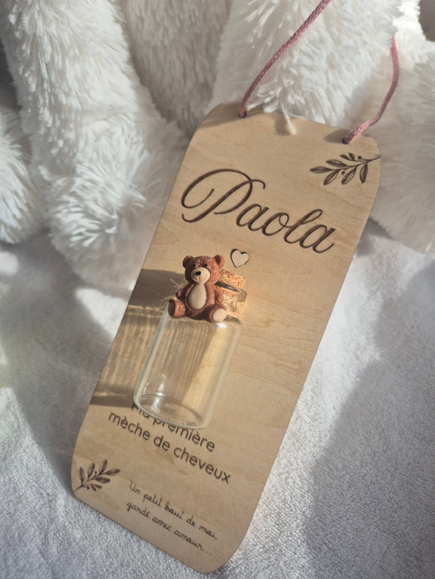 - Une jolie plaque en bois gravée “Ma première mèche de cheveux” + le prénom de votre enfant ;